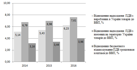Впродовж 2014-2016 рр. індикатори фіскальної значимості ПДВ мали неоднорідний характер. Так, питома вага ПДВ у доходах державного бюджету коливалась від 33,37% до 38,93%, при середньому значенні 36,84%. Це свідчить про вагоме місце даного податку у джерелах формування бюджету України. Більш значимим у доходах Державного бюджету було ПДВ із ввезених на територію України товарів, який за досліджуваний період в середньому складав 28,48%.