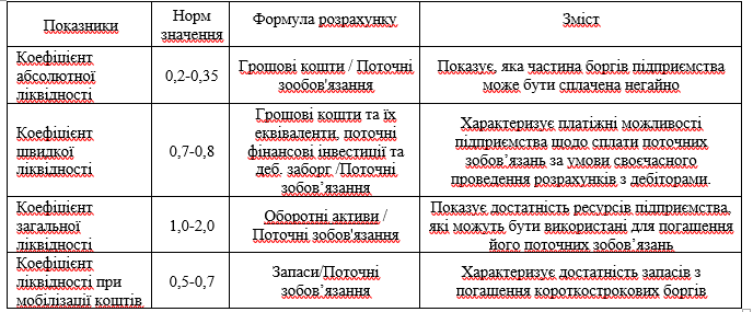 | Коефіцієнт забезпеченості власними оборотними коштами | >0,1 | Власний оборотний капітал/ Оборотні активи | Показує рівень фінансування оборотних активів за рахунок довгострокових джерел фінансових ресурсів |