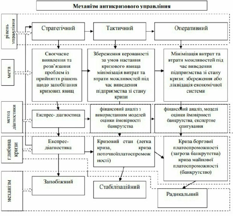 Механізм антикризового управління є засобом впливу на послідовність і взаємообумовленість економічних процесів, що забезпечують конструктивну реакцію на зміни, які загрожують нормальному функціонуванню підприємства.